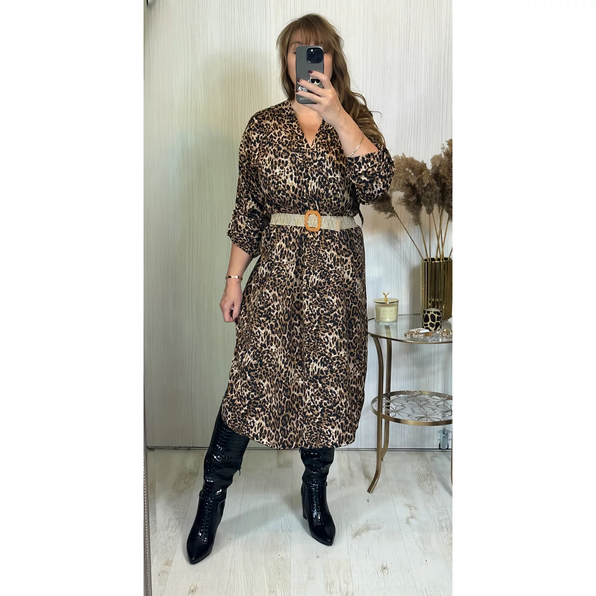 Az idei év nagy slágere a leopárd mintás ruha. Kényelmes, bő szabású ruha. Nyakrésze V kivágású, mely optikailag karcsúsítja az alakot. A hozzá tartozó övvel kiemelheted a derekadat, de öv nélkül is viselheted. Az övet küldjük a ruhához.